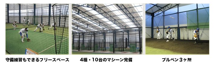 当スタジアムの代表が自ら考案した、 日本初の画期的なティーバッティング練習用マシン「ビーコンマシーン」を筆頭に、 バッティングの技術を高めるための様々なマシーン、 守備やピッチングのレベルアップのための工夫がふんだんに盛り込まれています。